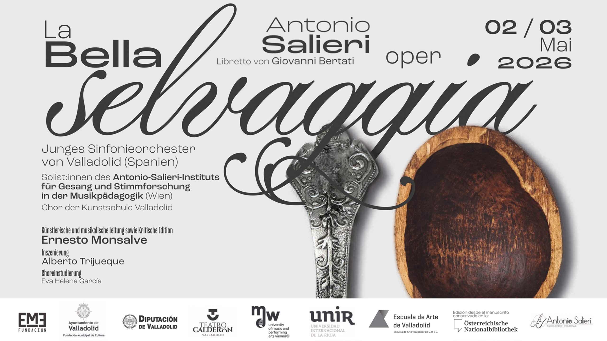 Como colofón y clausura del Año Salieri, al conmemorarse el Bicentenario de la Muerte del célebre Hofkapellmeister del Sacro Imperio Romano-Germánico, la JOSVa participará en el estreno mundial de su última ópera: «La bella selvaggia». Compuesta en 1802, quedó inédita hasta la presente elaboración de su edición crítica, tras el trabajo desempeñado bajo la dirección de Ernesto Monsalve (UNIR) con la Biblioteca Nacional de Austria.